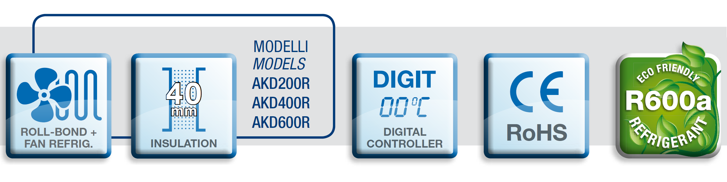 Chladící skříně AKD/R s ekologickým statickým chlazením a přídavným ventilátorem pro rovnoměrné rozložení teploty i při častém otevírání dveří. Chladící skříně jsou vhodné pro uchování masa, uzenin, zeleniny a dalších potravin. Snadné elektronické ovládání s displejem integrované ve dveřích, automatické odtávání a odpařování kondenzátu, skříně jsou ve standardu vybaveny zámkem dveří a snadno vyjímatelným magnetickým těsněním. Kvalitní izolace stěn, pevný hygienický vnitřní prostor v bílém ABS plastu (hygienické prolisované provedení) v základu dodávány se 2 polohovatelnými policemi v rozměru (505x415 mm) a jednou menší policí u agregátu (505x225 mm). Nerezové opláštění skříně (modely s označením „SS“), případně v bílém laku.