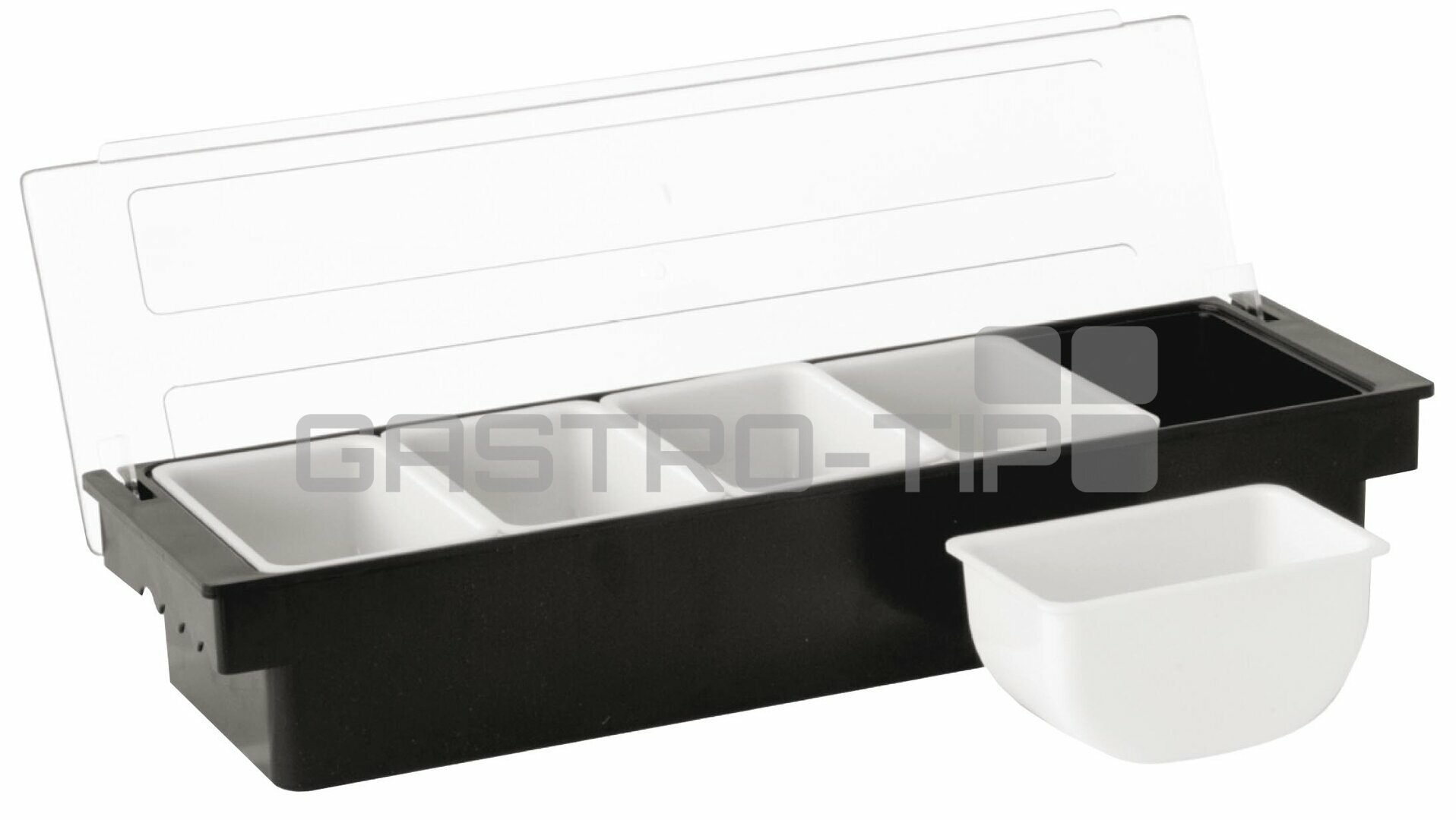 Zásobník na přísady s pěti vyjímatelnými nádobkami. Rozměry zásobníku jsou 495x157x95 mm.