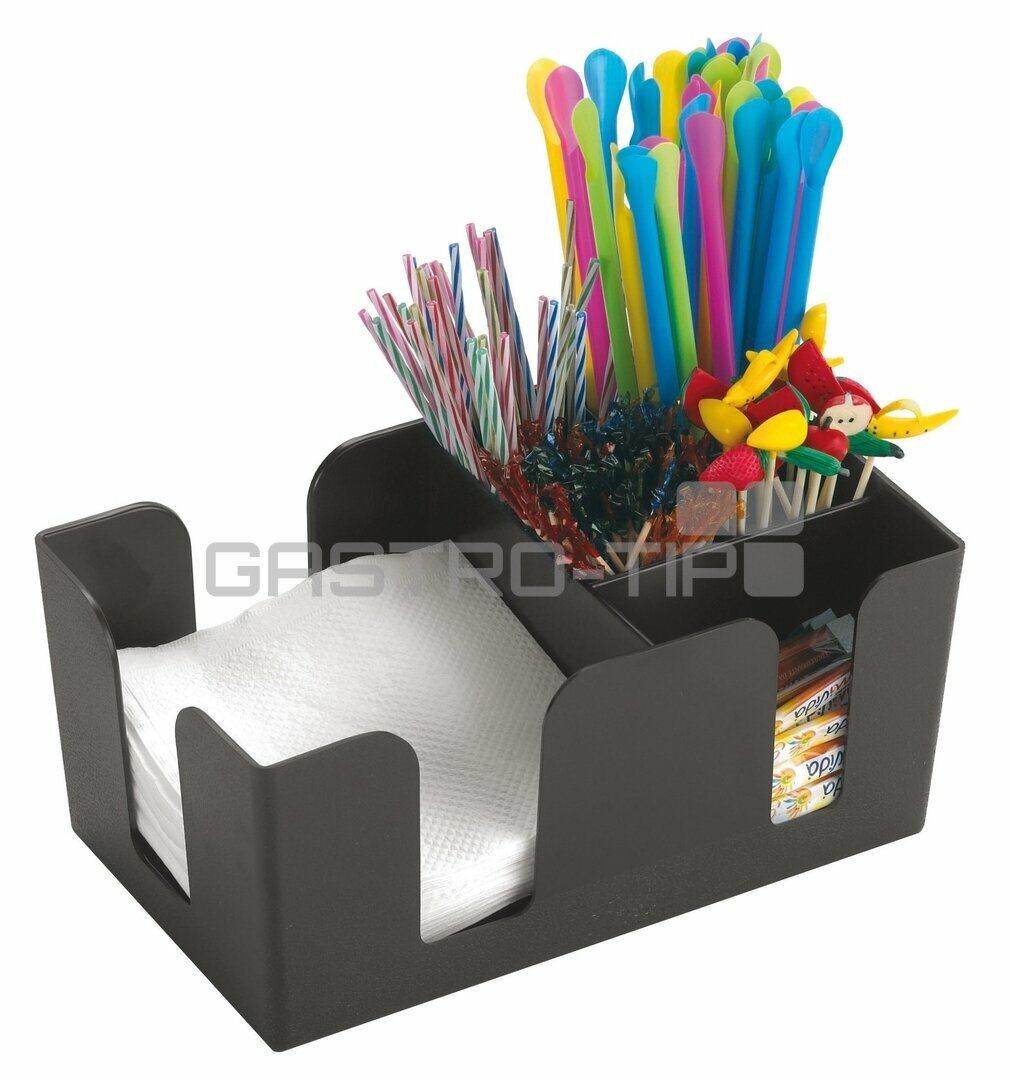 Plastový černý zásobník se třemi přihrádkami(ubrousky, brčka, cukr).