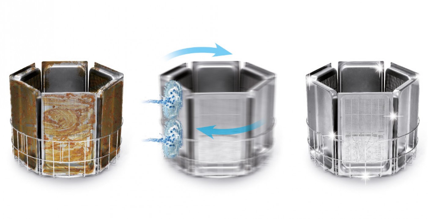 - Nadstandardní hodinový mycí výkon až 90 plechů/h GN1/1 (530x325 mm) nebo 30 plechů/h GN2/1 (650x530 mm),