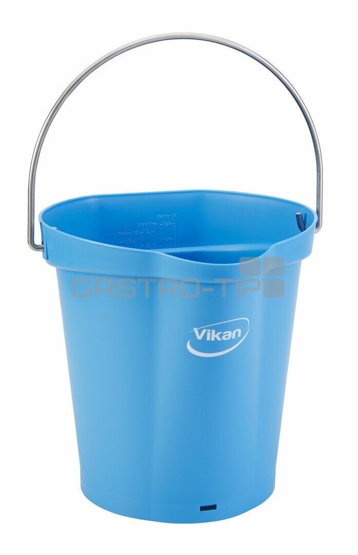Odolné 6 litrové vědro s nerezovou rukojetí, úchytem ve dně, vnitřními kalibračními měrkami různých jednotek a výlevkou pro směrování kapaliny do jednoho proudu. Výrobek je určený pro mytí nebo skladování přísad. Zadní plocha vědra slouží pro zavěšení do nástěnného držáku Vikan 16200.