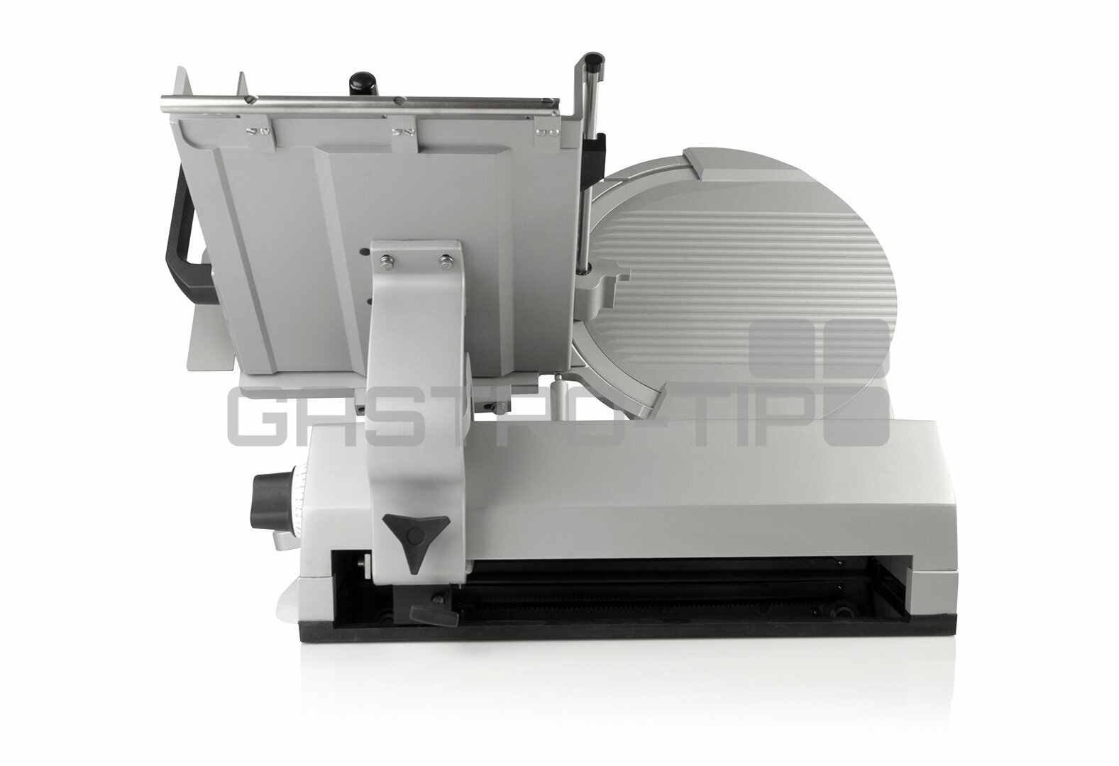 Poloautomatický nářezový stroj MASTER SA 3370 s gravitačním ukládáním plátků (bez možnosti skládání a programování) v provedení CERA3. Lepší kluzné vlastnosti, odolnost a snadné čištění stroje, speciální úchyt umožňující bezproblémové krájení vychlazené měkké uzeniny.