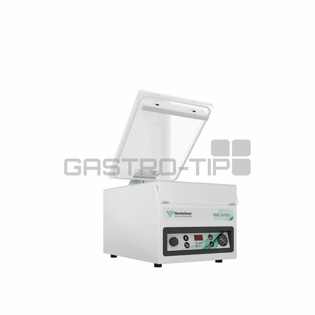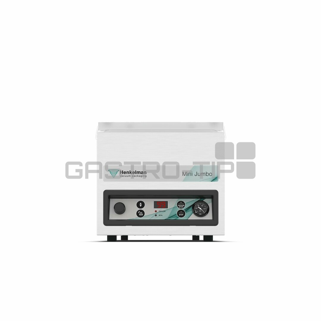 Zařízení slouží k vakuovému balení výrobků (produktů) do vakuových sáčků. Prodlužte trvanlivost masa, drůbeže, ryb, sýrů, zeleniny a dalších potravin včetně tekutin. Ochraňte je před působením vnějších vlivů. S profesionální vakuovou baličkou Jumbo Plus od holandské firmy Henkelman to půjde snadno. Jednokomorová programovatelná balička v robustním celonerezové provedení s lisovanou vanou se hodí pro provozy různých zaměření. Model s rovným průhledným víkem, řízena časově (vakuum a lišta), hloubka komory s víkem 85 mm slouží k vakuovému balení pokrmů a potravinářských výrobků do vakuových sáčků.