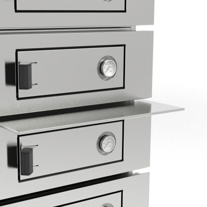 Teplota v komorách je zobrazena analogovými teploměry. Teploměry jsou obklopeny průhledným sklem, aby bylo možné