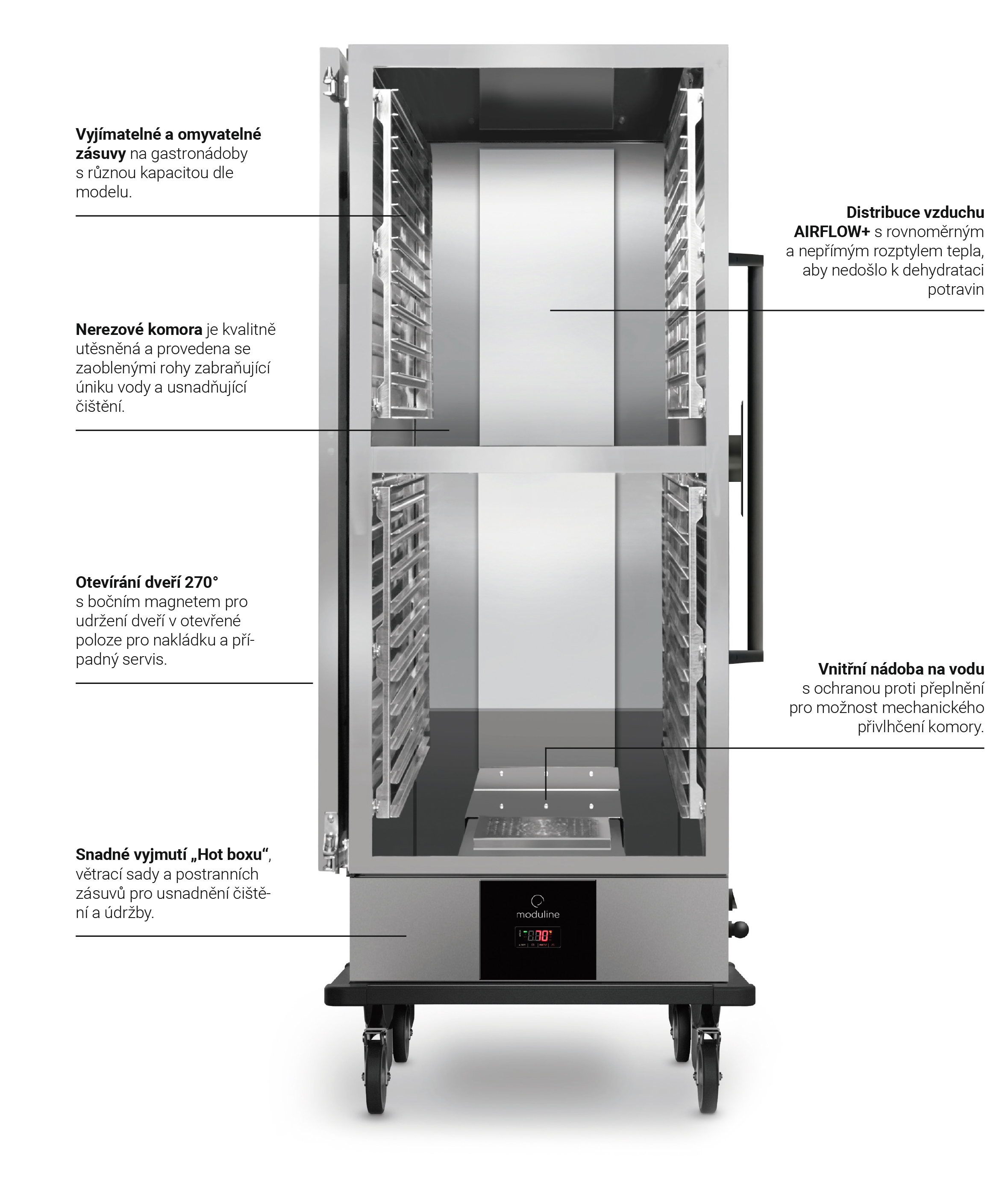 Moduline AIRFLOW+ je nová řada banketových vozíků s ventilovaným ohřevem pro catering. Modely AIRFLOW+ nabízí řadu ventilovaných vozíků, které jsou ideální pro rychlou obslužnost Transport, udržení a výdej teplého jídla v jídelnách, v hotelových, konferenčních sálech, nemocnicích, domovech důchodců a dalších stravovacích provozech. Horký vzduch je vytvářen „zásuvkou Hot Box“ umístěnou ve spodní části vozíku a následně dynamicky distribuován do vzduchového dopravníku umístěného v zádech komory vozíku, tak aby se teplo rovnoměrně rozvádělo a rozprostřelo uvnitř komory a dostalo do všech zásuvů bez přímého proudění na jídlo. Tímto způsobem AIRFLOW+ zabraňuje nežádoucí dehydrataci a povrchovému připalování jídla, typický efekt mnoha ventilovaných vozíků. „Hot box“ je vybaven nádržkou na vodu pro možnost mechanického přivlhčování komory pomocí odpařování vody. Vozíky jsou vybaveny a řízeny digitálním regulátorem teploty (snadné ovládání), příplatkově může být vybaven Wifi modulem pro vzdálené připojením a ovládání zařízení pomocí cloudové aplikace (volitelné). Modely ABK jsou v elegantním černém designu a výbavě, která zahrnuje lesklé černé plexi vnější panely se zaoblenými hranami, dlouhá postranní madla pro snadnou manipulaci a dále velký boční kabelový naviják.