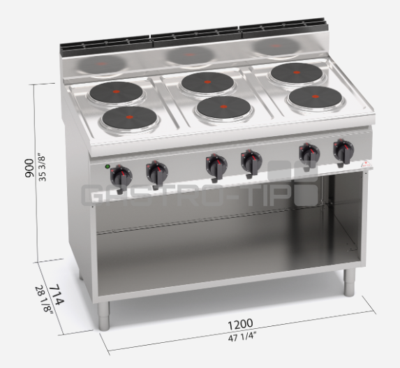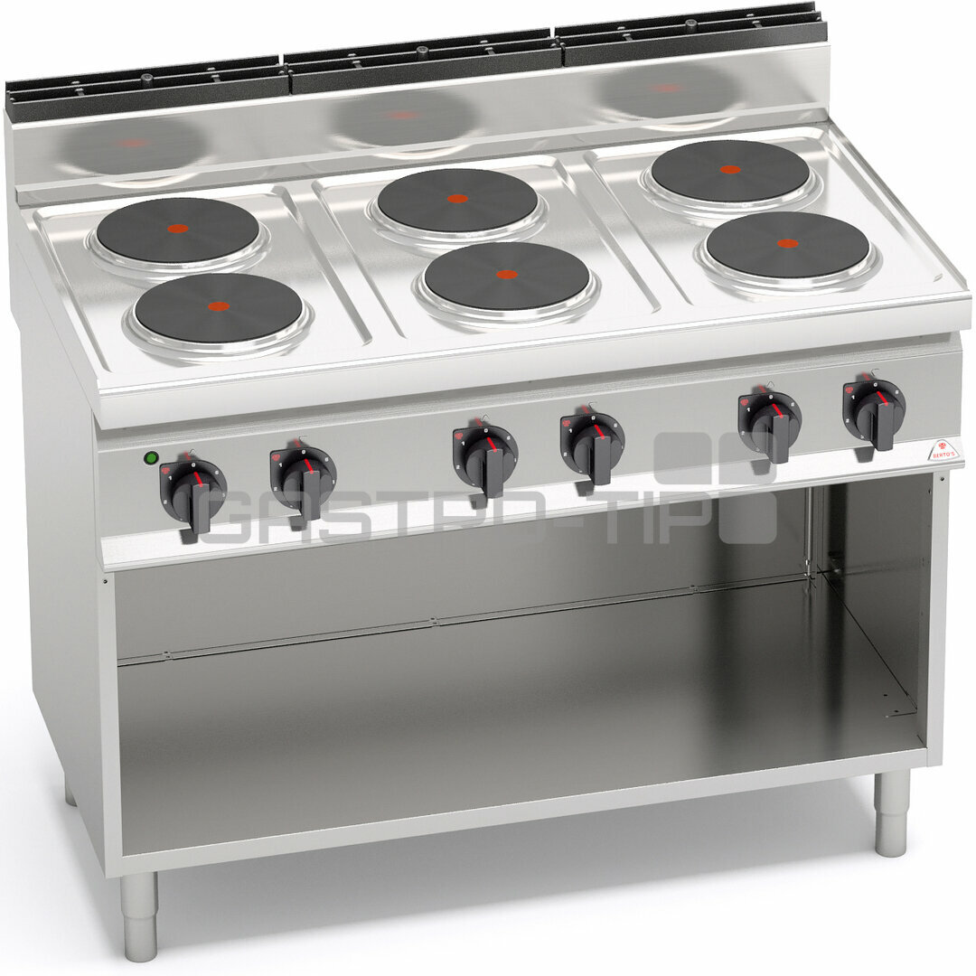 Pracovní plocha a opláštění z nerez oceli AISI 304. Litinové varné plotýnky s bezpečnostním termostatem a regulací výkonu. Kompaktní provedení s otevřeným podstavcem.