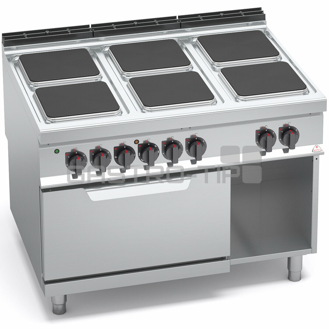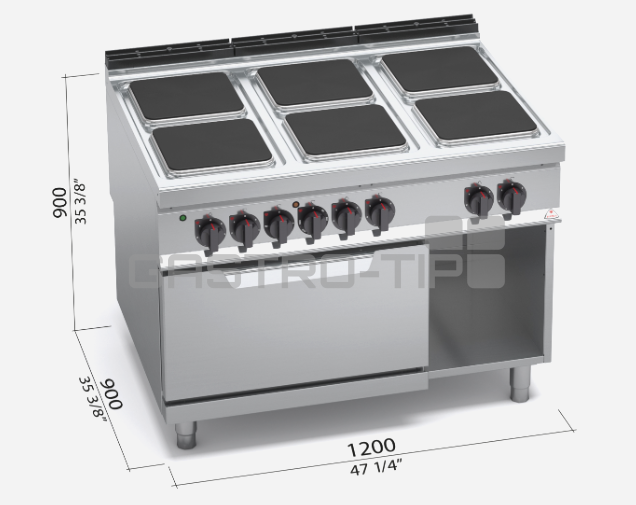 Pracovní plocha a opláštění z nerez oceli AISI 304. Litinová varné plotýnky s bezpečnostním termostatem a regulací výkonu. Kompaktní provedení s el.statickou multifunkční troubou GN 2/1. Sporák je vybaven čtyřmi varnými plotýnkami z litiny s plochou 300x300 mm. Každá plotýnka má výkon 3,5 kW a dosáhne teploty 400 °C. Pracovní plochu lze doplnit o ocelovou výplň prostoru mezi plotnami, čímž se dosáhne celistvé pracovní plochý. Teplota je regulována nezávisle nastavitelnými spínači. Přímá kontrola teploty umožňuje významně uspořit energie. Topná tělesa jsou hermeticky uzavřena v jednom celku, který je lisovánv rovině do varné desky. Konvekční trouba vhodná pro GN 1/1, nebo model se statickou multifunkční troubou pro GN 2/1. Trouby mají nově zesílené litinové dno a jsou vybaveny kvalitním těsněním dveří.