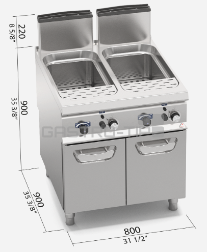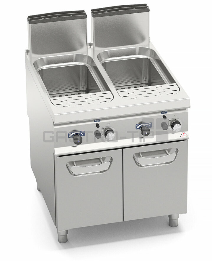 Ideální zařízení pro vaření těstovin, rýže, zeleniny a vajec díky rychlému vaření vody. K dispozici ve verzi plynové a elektrické. Přívod vody je umístěn přímo na pracovní ploše, což umožňuje snadné dopouštění, výměnu vody a odplavování nečistot přepadem. Vana je vyrobena z nerez oceli AISI 316 o objemu 40 litrů se zaoblenými hranami a vybavena vyjímatelným perforovaným dnem pro ukládání košů.​