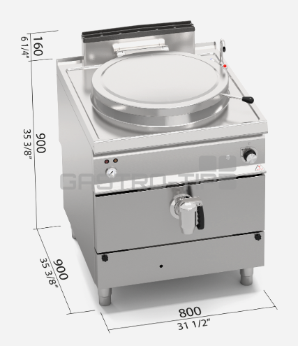 Nepřímý ohřev s nízkotlakou párou (0,5 bar) generovanou v meziplášti trubkovým hořákem z nerezové oceli s optimalizovaným spalováním, bezpečnostním ventilem, termočlánkem a chráněným zápalným plamýnkem. Piezoelektrické zapalování s gumovou ochranou. Regulace teploty ventilem s horní a dolní pozicí.Ve standardu automatické dopouštění vody do dvoupláště a elektrické zapalování.